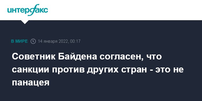 Москва. 14 января. INTERFAX.RU - Санкции США против других стран не всегда позволяются добиться всех поставленных задач, заявил советник президента США по нацбезопасности Джейк Салливан.