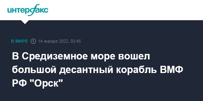 Москва. 14 января. INTERFAX.RU - Большой десантный корабль (БДК) ВМФ РФ "Орск", пройдя Босфор, вошел в акваторию Средиземного моря, сообщили в соцсетях стамбульские наблюдатели, публикующие фотографии его прохождения через пролив.