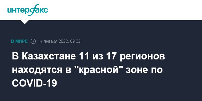 Москва. 14 января. INTERFAX.RU - В Казахстане по состоянию на пятницу, 14 января, три города и восемь областей находятся в "красной" зоне по темпам распространения COVID-19, сообщила межведомственная комиссия по нераспространению коронавируса.