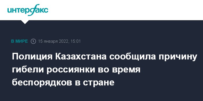 Москва. 15 января. INTERFAX.RU - В Жамбылской области Казахстана началось расследование по факту гибели россиянки во время беспорядков, сообщил в субботу областной департамент полиции.