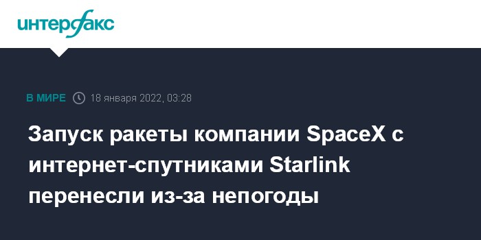 Москва. 18 января. INTERFAX.RU - В связи с неблагоприятными погодными условиями запуск тяжелой ракеты-носителя Falcon 9 с очередной партией из 49 мини-спутников для пополнения орбитальной группировки глобальной сети интернет-покрытия системы Starlink, планировавшийся во вторник по московскому времени, перенесен на сутки, сообщила компания-разработчик SpaceX.