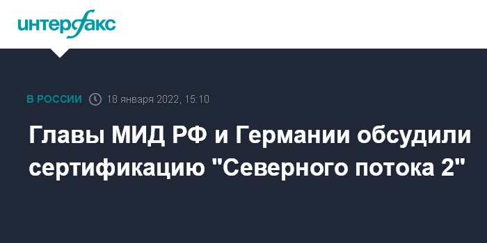 Москва. 18 января. INTERFAX.RU - Главы МИД России и ФРГ Сергей Лавров и Анналена Бербок обсудили во вторник сертификацию "Северного потока 2", указав на неконструктивность попыток политизации этой темы.