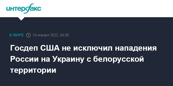 Москва. 19 января. INTERFAX.RU - Высокопоставленный представитель Госдепартамента США заявила журналистам, что в США рассматривают перемещение российских военных в Белоруссию как возможную подготовку к вторжению на Украину.