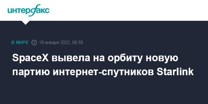 Москва. 19 января. INTERFAX.RU - Тяжелая ракета-носитель Falcon 9 в среду по московскому времени успешно вывела на орбиту партию из 49 мини-спутников, предназначенных для продолжения развертывания глобальной сети интернет-покрытия системы Starlink, сообщила компания-разработчик SpaceX в твиттере.