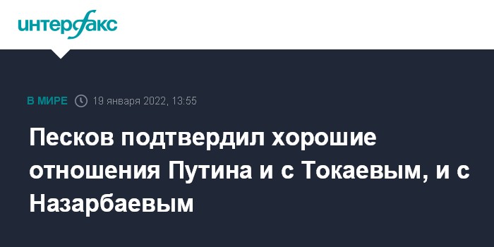 Москва. 19 января. INTERFAX.RU - У президента Владимира Путина сохраняются очень теплые отношения как с действующим президентом Казахстана Касым-Жомартом Токаевым, так и с первым президентом этой страны Нурсултаном Назарбаевым, заявил пресс-секретарь Путина Дмитрий Песков.