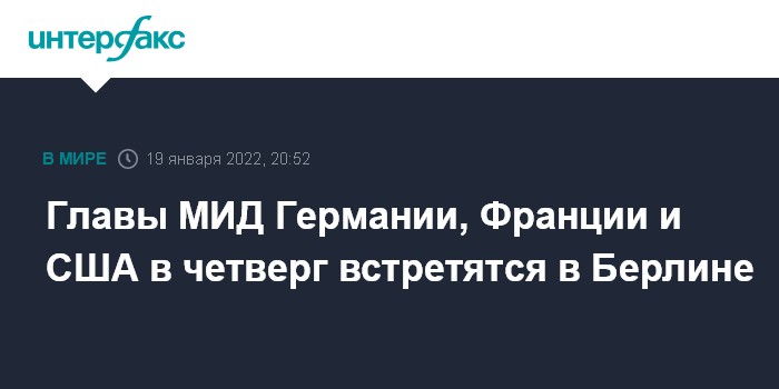 Москва. 19 января. INTERFAX.RU - Глава МИД Германии Анналена Бербок в четверг в Берлине принимает своих коллег из Франции, США и Великобритании, сообщает пресс-служба немецкого министерства.