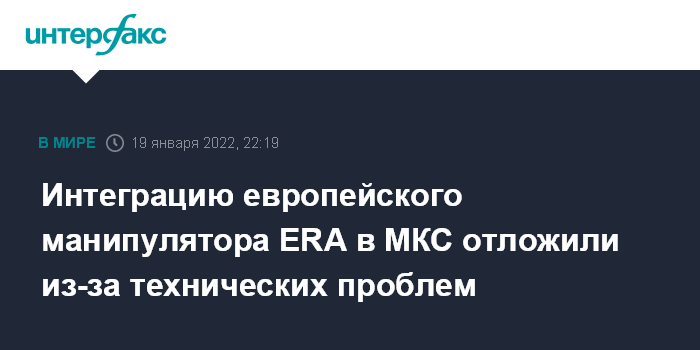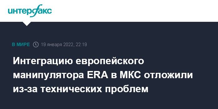 Москва. 19 января. INTERFAX.RU - Работы по интеграции европейского манипулятора ERA в состав МКС отложены из-за технических проблем с манипулятором, сообщил начальник отдела внекорабельной деятельности Ракетно-космической корпорации "Энергия" Александр Полещук.