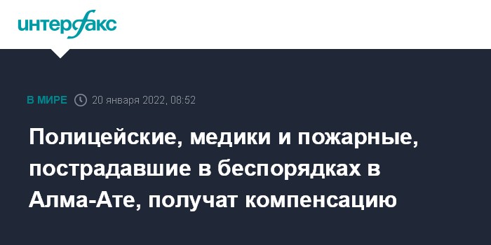 Москва. 20 января. INTERFAX.RU - В Алма-Ате сотрудникам правоохранительных органов, медицинским работникам и пожарным, задействованным в период ЧП, будет оказана материальная помощь, а получившим ранения и травмы - выплачена компенсация, сообщил аким (мэр) мегаполиса Бакытжан Сагинтаев.
