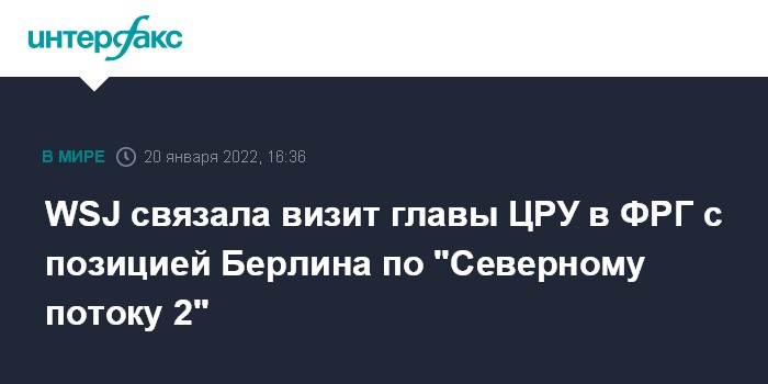 Москва. 20 января. INTERFAX.RU - Директора ЦРУ Уильяма Бернса ранее в январе отправили на переговоры в Берлин, в том числе, в связи с отсутствием публичных заявлений канцлера ФРГ Олафа Шольца о готовности заморозить газопровод "Северный поток 2" в случае вторжения России на Украину, пишет газета The Wall Street Journal со ссылкой на источники в дипломатических кругах.