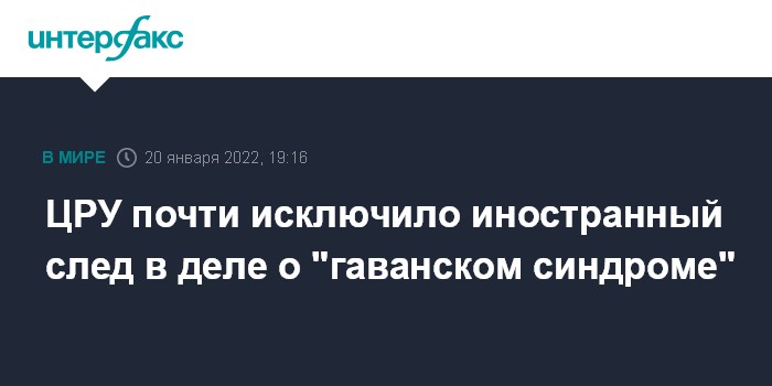 Москва. 20 января. INTERFAX.RU - В ЦРУ почти полностью исключили возможность какого-либо иностранного вмешательства в случаи проявления "гаванского синдрома" у американских дипломатов, в большинстве ситуаций заболевание было вызвано медицинскими или природными причинами, пишет The New York Times.