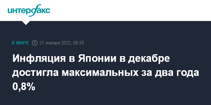 Москва. 21 января. INTERFAX.RU - Потребительские цены в Японии в декабре увеличились на 0,8% по сравнению с тем же месяцем годом ранее, свидетельствуют данные министерства внутренних дел и коммуникаций страны.