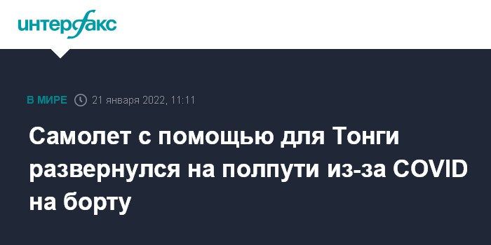 Москва. 21 января. INTERFAX.RU - Австралийский самолет с грузом гуманитарной помощи для пострадавших от извержения вулкана и цунами жителей островов Тонга развернулся на полпути и вернулся в аэропорт вылета из-за того, что у одного человека на борту оказался положительный тест на коронавирус.