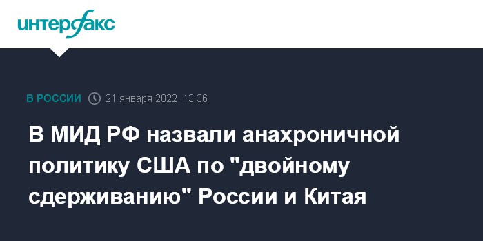 Москва. 21 января. INTERFAX.RU - Политика США по сдерживанию России и Китая устарела и бесперспективна для самой Америки, заявили в пятницу в МИД РФ.