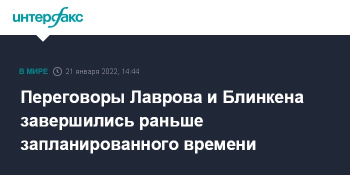 Москва. 21 января. INTERFAX.RU - В Женеве завершились переговоры главы МИД РФ Сергея Лаврова и госсекретаря США Энтони Блинкена, посвященные российским предложениям по гарантиям безопасности, они продолжались меньше запланированного времени - полтора часа.