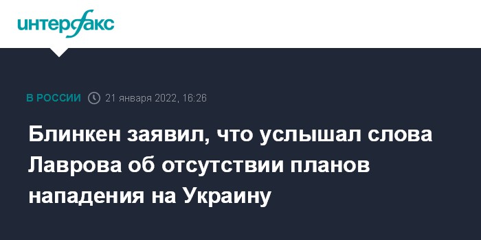 Москва. 21 января. INTERFAX.RU - Госсекретарь США Энтони Блинкен заявил после переговоров в Женеве с главой МИД РФ Сергеем Лавровым, что услышал слова коллеги об отсутствии у РФ планов вторжения на Украину.