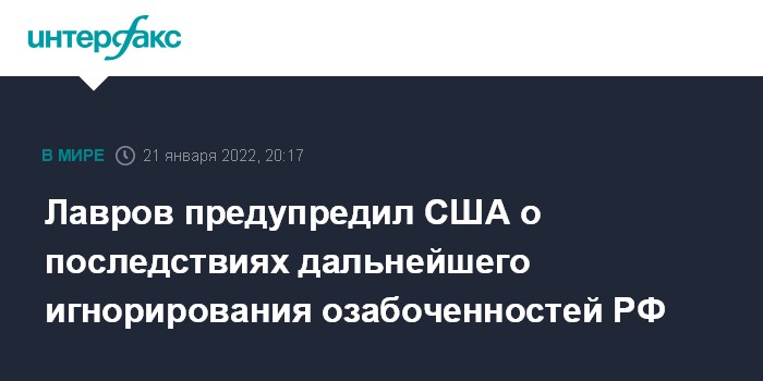 Москва. 21 января. INTERFAX.RU - Глава МИД РФ Сергей Лавров в ходе встречи в Женеве заявил госсекретарю США Энтони Блинкену о серьезных последствиях дальнейшего игнорирования озабоченностей России, связанных в первую очередь с продолжающимся военным освоением Соединенными Штатами и НАТО территории Украины.
