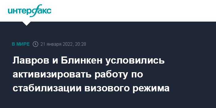 Москва. 21 января. INTERFAX.RU - Глава МИД РФ Сергей Лавров и госсекретарь США Энтони Блинкен на встрече в Женеве условились активизировать работу по нормализации функционирования диппредставительств двух стран и стабилизации визового режима, сообщил МИД РФ.
