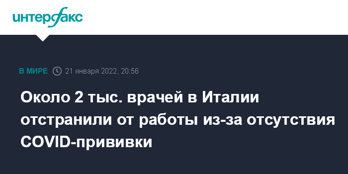 Москва. 21 января. INTERFAX.RU - Почти 2 тыс. медиков отстранены от работы в Италии, так как они не сделали прививки против COVID-19, сообщает в пятницу EFE со ссылкой на Национальную федерацию по управлению в сфере медицины.