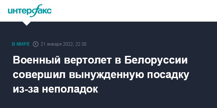 Москва. 21 января. INTERFAX.RU - Из-за неполадок с двигателем в пятницу совершил вынужденную посадку военный вертолет Ми-24, сообщили в пресс-службе министерства обороны Белоруссии.