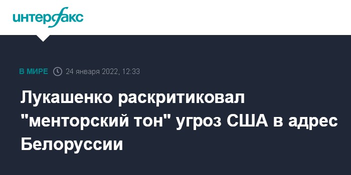 "Буквально сутки назад до меня довели угрожающую позицию госдепа США. Приехали к нашим дипломатам в Нью-Йорке и угрожают нам: да если вы позволите Путину и России, позволите это, то, то - мы введем санкции. Если вы ядерное оружие вернете в Белоруссию, будет то и это. Понимаете, менторский какой-то тон в отношении Белоруссии", - заявил Лукашенко во время встречи с главой Госпогранкомитета страны Анатолием Лаппо.