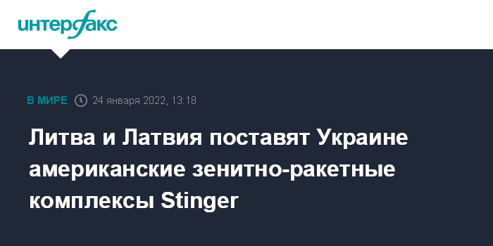 Москва. 24 января. INTERFAX.RU - Литва передаст армии Украины американские переносные зенитно-ракетные комплексы (ПЗРК) Stinger, поскольку Россия концентрирует силы на украинской границе. Об этом сообщило в понедельник министерство обороны Литвы.