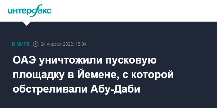 Москва. 24 января. INTERFAX.RU - Войска ОАЭ в понедельник разрушили пусковую площадку, откуда ранее йеменские повстанцы запустили по Абу-Даби две баллистические ракеты, впоследствии перехваченные, сообщает телеканал Al Arabiya со ссылкой на Минобороны ОАЭ.