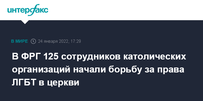 Москва. 24 января. INTERFAX.RU - В Германии 125 католических священников и иных сотрудников организаций, связанных с церковью, совершили каминг-аут и потребовали прекратить дискриминацию представителей ЛГБТ в церкви, пишет Deutsche Welle.