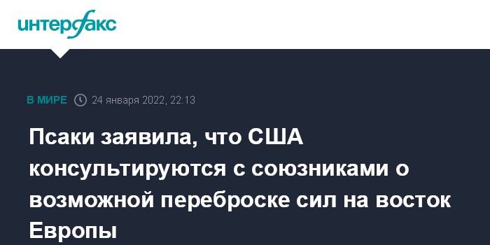 Москва. 24 января. INTERFAX.RU - Администрация США продолжает консультации по теме возможной переброски дополнительных сил в Восточную Европу, заявила представитель Белого дома Джен Псаки.
