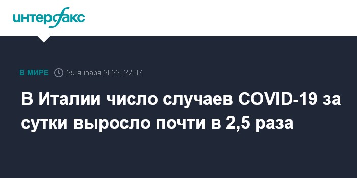 Москва. 25 января. INTERFAX.RU - В Италии за последние 24 часа медики выявили более 186 тысяч случаев заражения коронавирусом COVID-19 - почти в 2,5 раза больше, чем днем ранее, сообщают во вторник западные СМИ.