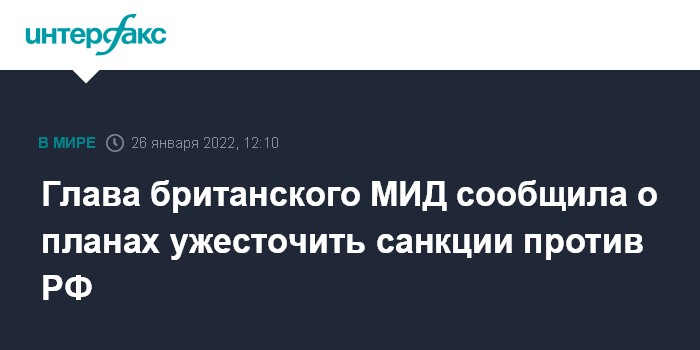 Москва. 26 января. INTERFAX.RU - В Великобритании в ближайшие дни может быть представлен проект новых более жестких санкций против ряда компаний и частных лиц в России, сообщила в среду в эфире Sky News глава британского МИД Лиз Трасс.