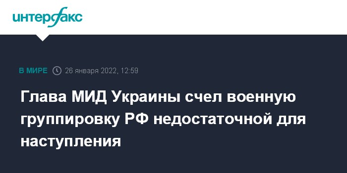 Москва. 26 января. INTERFAX.RU - Численности войск РФ у границы на данный момент недостаточно для полномасштабного наступления на Украину, заявил украинский министр иностранных дел Дмитрий Кулеба.