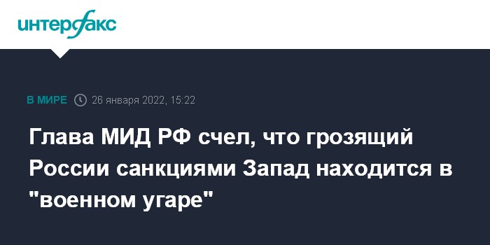 Москва. 26 января. INTERFAX.RU - Санкционные угрозы в адрес России свидетельствуют о том, что Запад находится в "военном угаре", Москва готова к любому развитию событий и надежнейшим образом обеспечит свою безопасность, заявил в среду глава МИД РФ Сергей Лавров.