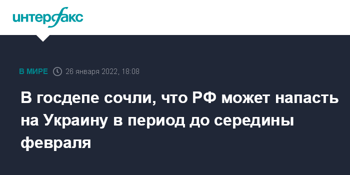 Москва. 26 января. INTERFAX.RU - Администрация США опасается, что РФ нападет на Украину в промежуток времени, заканчивающийся в середине февраля, заявила в среду первый замгоссекретаря Соединенных Штатов Уэнди Шерман.