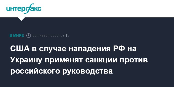 Москва. 26 января. INTERFAX.RU - Администрация США в случае нападения РФ на Украину будет стремиться к санкциям, которые ударят по экономическим интересам российского руководства, заявила в среду представитель Белого дома Джен Псаки.
