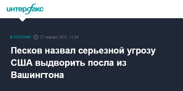 Днем ранее посол России в Вашингтоне Анатолий Антонов заявил, что Госдепартамент пообещал поставить вопрос о его отъезде из США, если Россия не выдаст визы охранникам американского посольства в Москве. Пескова в четверг спросили, насколько серьезной в Кремле считают эту угрозу и насколько допустимы угрозы отзыва российского посла.