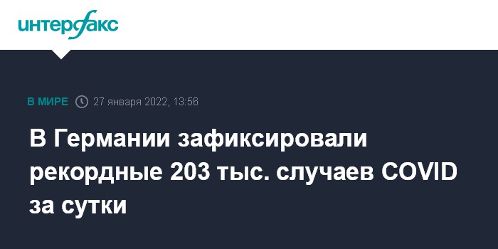 Москва. 27 января. INTERFAX.RU - Немецкий институт Роберта Коха в четверг зафиксировал новый рекорд заболеваемости коронавирусом, за прошедшие сутки выявлено еще 203 136 заболевших.
