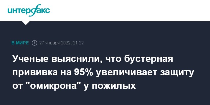 Москва. 27 января. INTERFAX.RU - "Бустерная" доза вакцины от коронавируса COVID-19 на 95% увеличивает защиту от штамма "омикрон" у людей старше 50 лет, сообщает The Guardian со ссылкой на Агентство безопасности здравоохранения Соединенного королевства (UKHSA).