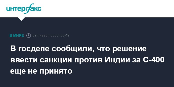 Москва. 28 января. INTERFAX.RU - Администрация США пока не определила, грозят ли Индии санкции в рамках закона CAATSA за покупку российских систем С-400, заявил в четверг представитель госдепа Нед Прайс.