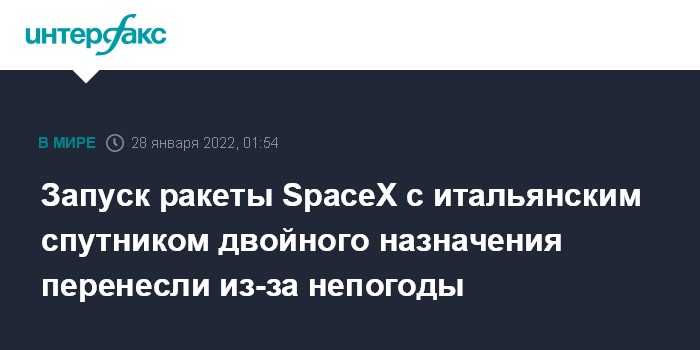 Запуск ракеты SpaceX с итальянским спутником двойного назначения перенесли из-за непогоды