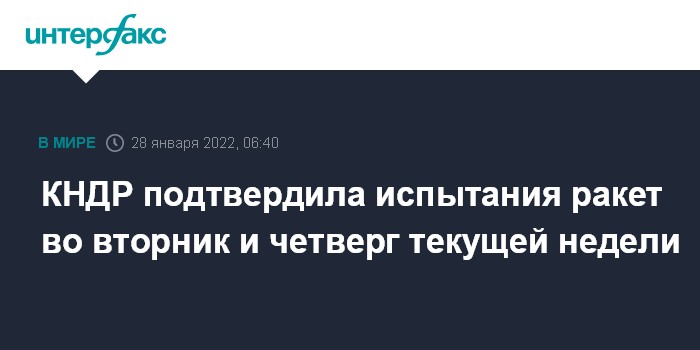 Москва. 28 января. INTERFAX.RU - Во вторник и четверг текущей недели КНДР осуществила испытательные пуски ракет, чтобы проверить усовершенствованные системы ракет и эффективность боеголовок управляемых ракет класса "земля-земля", сообщило Центральное телеграфное агентство Кореи (ЦТАК).