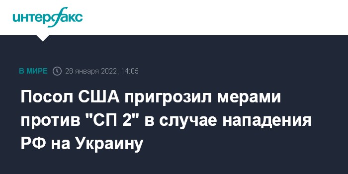 Москва. 28 января. INTERFAX.RU - Меры против "Северного потока 2" станут частью ответа Запада в случае нападения России на Украину, заявил посол США в Москве Джон Салливан.