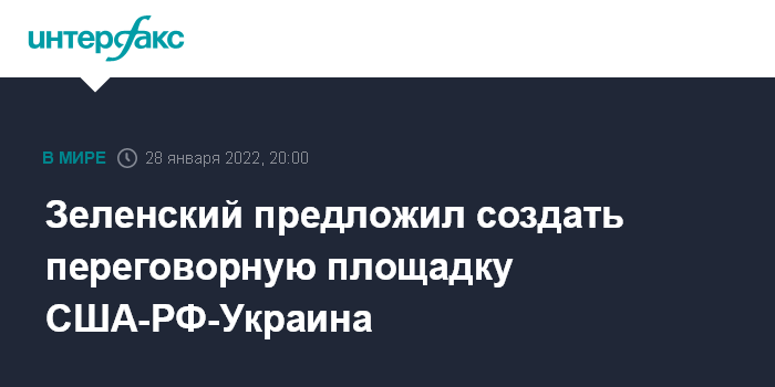 Москва. 28 января. INTERFAX.RU - Президент Украины Владимир Зеленский заявил, что хотел бы создания переговорной площадки по урегулированию ситуации на востоке страны в формате США-Россия-Украина.