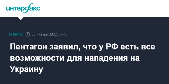 Москва. 28 января. INTERFAX.RU - Администрация США по-прежнему не определила, намерена ли Россия нападать на Украину, однако полагает, что с военной точки зрения у Москвы теперь есть все для совершения подобной атаки, заявил в пятницу глава Пентагона Ллойд Остин.