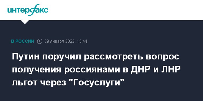 "Рассмотреть вопрос о предоставлении гражданам РФ, проживающим на территориях отдельных районов Донецкой и Луганской областей Украины, возможности подачи с использованием единого портала государственных и муниципальных услуг заявлений на получение социальных выплат и льгот без указания регистрации по месту жительства на территории РФ и при необходимости представить предложения об изменении порядка предоставления соответствующих социальных выплат и льгот", - говорится в перечне поручений президента.