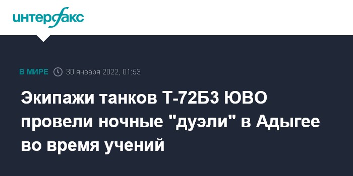 Москва. 30 января. INTERFAX.RU - Танкисты военной базы Южного военного округа в Адыгее провели ночные бои на современных танках Т-72Б3 в рамках занятий по оперативной и боевой подготовке, сообщает пресс-служба ЮВО.