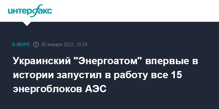 Москва. 30 января. INTERFAX.RU - НАЭК "Энергоатом" Украины утром в воскресенье подключил к энергосистеме энергоблок №4 Ривненской АЭС, таким образом запустив в работу все имеющиеся 15 энергоблоков.
