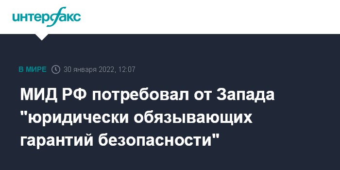 Москва. 30 января. INTERFAX.RU - Россия будет добиваться от Запада не просто обещаний, а юридически обязывающих гарантий своей безопасности, заявил глава МИД РФ Сергей Лавров.