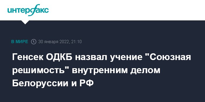 Москва. 30 января. INTERFAX.RU - Совместное российско-белорусское учение "Союзная решимость - 2022" является внутренним делом Белоруссии и России и не представляет угрозы третьим странам, заявил генсек Организации Договора о коллективной безопасности (ОДКБ) Станислав Зась.