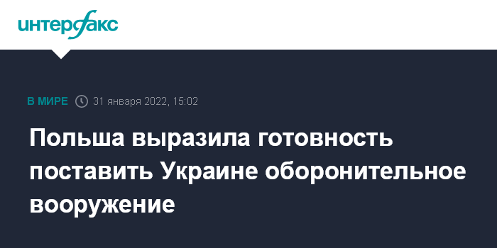 Москва. 31 января. INTERFAX.RU - Глава польского Бюро национальной безопасности Павел Солох заявил о готовности Варшавы передать Украине оборонительное вооружение, сообщила в понедельник радиостанция Zet News.