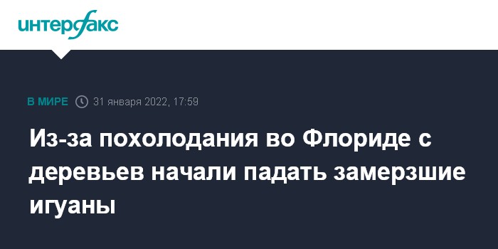 Москва. 31 января. INTERFAX.RU - Во Флориде из-за заморозков игуаны начали впадать в оцепенение и падать с деревьев на землю, сообщает BBC News.
